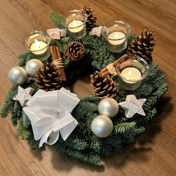 Unsere Adventskränze bestehen aus frischem Tannengrün und werden von Floristen liebevoll dekoriert. So erhältst du deinen Adventskranz fix und fertig nach Hause geliefert – Kerzen inklusive.