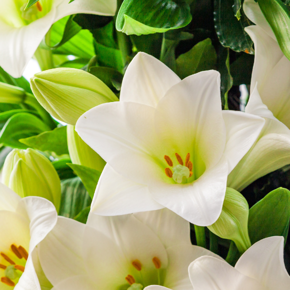 Weiße Lilien sind vor allem im katholischen Raum stark verbreitet. Sie symbolisieren Reinheit, Auferstehung und das Göttliche. In vielen Kirchen schmücken sie zu Ostern Altäre und Prozessionen.